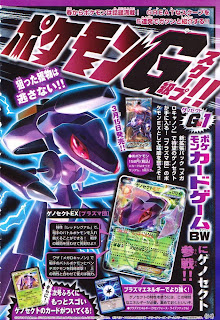 A nova scan, porém acredito que não seja a última scan da CoroCoro ainda revelada, visto que a de cima tem metade cortada, traz informações sobre o TCG. Há algum tempo havíamos informado que a próxima expansão de TCG no Japão se chamariaMegalo Cannon, e seria focada em Genesect. Pois bem, a scan apresentou as duas cartas do Pokémon, uma normal e outra EX, ambas do tipo Grass.